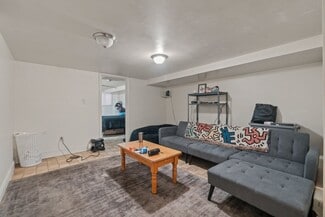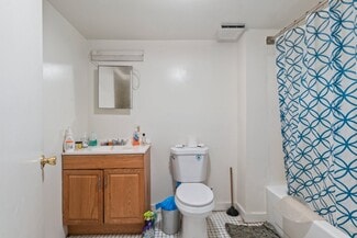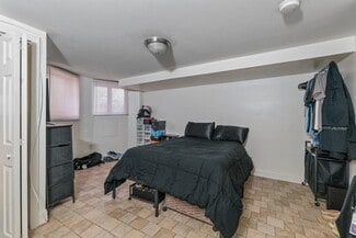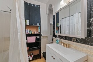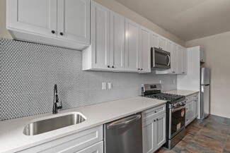 The terrace-level one-bedroom apartments have a more modest finish level, with drywall walls and ceilings accented by some painted brick. Kitchens feature wood cabinetry, laminate countertops, and either a 30? gas or electric stove. Bathrooms are updated with steel or fiberglass tubs and modern vanities. One of the two one-bedroom units includes in-unit laundry.