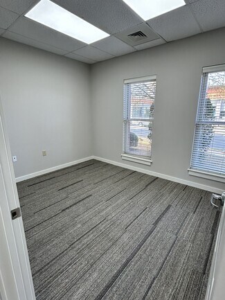 Attractive office building in Matthews Corner Development. First floor space with great light, new carpet and paint, kitchenette, plenty of parking. 1 larger and 2 smaller offices in place, open space can be configured to meet your requirements. Across the street from newly developed Ames St Marketplace (brewery, restaurants, shops) and one block walk to downtown Matthews.