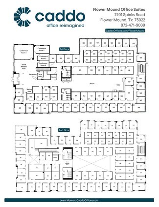 Caddo Flower Mound is a new construction built in 2021 and is conveniently located at 2201 Spinks Rd., Flower Mound, Texas with easy access to Plano, Addison and Dallas. The Flower Mound location has private office suites, a large coworking space, beautifully staged day office and designer conference rooms. We offer Day Offices and Social Membership for those who need an occasional quiet and professional work environment. The office suites, day office and social membership includes complimentary parking, WiFi, security cameras, 24-hour access, mailboxes, elevator, printer, refrigerators, microwaves, Keurig Coffee machines, filtered water and ice, on-site management, and conference rooms. All office suite and social memberships include access to all 9 Caddo locations in Plano, McKinney, Allen, Frisco, Flower Mound, Prosper, Lakewood and North Tarrant.