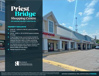 Priest Bridge Centre is prominently located at the intersection of Crain Hwy (MD Route-3) and Defense Hwy (MD-450) in Crofton, providing excellent access to Crofton, Gambrills and Bowie. The center has 3,000-15,200 +/- SF of prime retail space available, allowing an anchor tenant the ability to occupy up to 15,200 SF and 750 SF - 9,700 +/- SF of Office Space available on for lease.