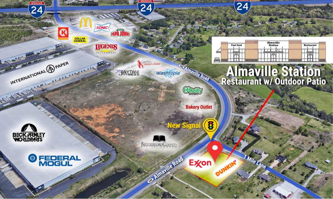 Property is at high traffic corner with good daytime population in fast growing market area.? Easy access from Almaville Rd or One Mile Lane with high density of homes and industrial area along with ease access to Interstate 24. LL to provide exterior walls, roof, store fronts, parking, landscaping, grease trap in line, and dumpster service.? LL to provide some tenant improvement allowance to be negotiated.?