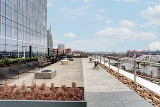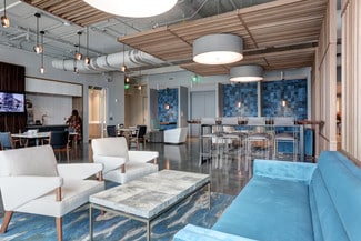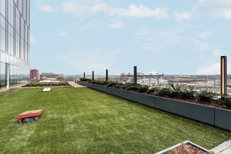 Large outdoor terrace for common tenant use with seating, fire pits, bocce, outdoor televisions, and bar service.