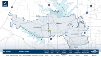 The property is accessed by South Garden Ridge Boulevard and surrounded by mature neighborhoods with homes ranging from ±$375,000 to ±$675,000, with some homes exceeding $1,000,000 to the west and southwest. S. Garden Ridge Blvd provides access to I-35 to the north, and Hwy 121 via Lakeside Parkway to the south. These thoroughfares connect the property to major entertainment and lifestyle destinations, employment centers, Lake Lewisville, Lake grapevine and DFW International Airport. Best in class retailers including Whole Foods Market, World Market, LA Fitness, Cheesecake Factory, Corner Baker, Banana Republic, and Mi Cocina are located only 15 minutes north, making this property ideal for an adaptive re-use, or redevelopment. Proximate to Major Employment Nodes: The Property boasts easy access to Highway 121 and Interstate 35, allowing for efficient commutes to major employment hubs including Denton, Addison, Uptown and Downtown Dallas. The Property is less than 5 miles from downtown Lewisville, Grapevine, and 20 minutes from Legacy West, Granite Park, Hall Park, Stonbriar Centre and The Star. Rare Development/Adaptive Re-Use Opportunity: The Property is one of the few large undeveloped tracts of land remaining in the heart of Flower Mound. Nearly all of the area surrounding the property is builtout with almost no land available for development. This phenomenon has contributed to the rise in existing home prices in the immediate area leaving a shortage of inventory for new homes. Experiential & Lifestyle Amenities: Located less than 15 minutes from downtown Lewisville, Coppell, and Grapevine, and 20 minutes from Grandscape, Legacy West, the Property provides a dynamic opportunity for professionals of all ages looking for an experiential lifestyle in a less dense environment. These lifestyles are driven by creative food, nightlife, and entertainment within a short distance from home. Impressive Demographics: Within two miles of the property, the population exceeds 50,000 people with median household incomes of over $104,000. Strong growth is projected to continue in this highly affluent submarket.