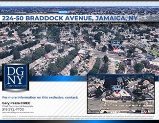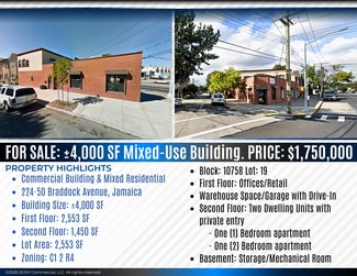 FOR SALE: Commercial Building & Mixed Residential 224-50 Braddock Ave., Jamaica Building Size: +/- 4,000 SF First Floor: 2,553 SF Second Floor: 1,450 SF Lot Area: 2,553 SF Zoning: C1 2 R 4 Block: 10758 Lot: 19 First Floor: Offices/Retail Warehouse space/Garage with Drive In Second Floor: Two Dwelling Units with private entry One (1) Bedroom apartment One (2) Bedroom apartment Basement: Storage/Mechanical Room Sale Price: $1,750,000