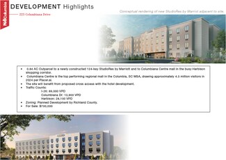 Located in the heart of Columbia’s premier retail corridor, 225 Columbiana Drive offers a rare opportunity to acquire a ±0.84-acre outparcel positioned directly beside a newly constructed 124-key StudioRes by Marriott. This site is part of the high-traffic Harbison retail district and benefits from direct adjacency to Columbiana Centre, the region’s top-performing mall with over 4.3 million annual visitors as of 2024. The parcel is zoned Planned Development (PD) by Richland County, allowing for flexible commercial uses and streamlined entitlement processes.
