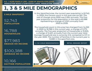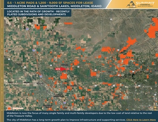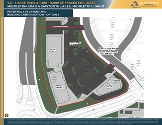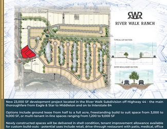 New 23,000 SF development project located in the River Walk Subdivision off Highway 44 - the main thoroughfare from Eagle & Star to Middleton and on to Interstate 84. Options include ground lease from half to a full acre, free-standing build to suit space from 3,000 to 9,000 SF, or multi-tenant in-line spaces ranging from 1,200 to 9,000 SF. Newly constructed spaces will be delivered in shell condition, tenant improvement allowance available for custom build-outs. The project is encompassed by other new commercial & residential developments in a soon to be undeserved market. Potential uses include retail, drive-through restaurant with patio, medical, office, professional service providers, and more. Surrounding retailers include Tractor Supply, Ridley’s, Family Dollar, Ace Hardware, O’Reilly Auto, Jack in the Box, Subway.
