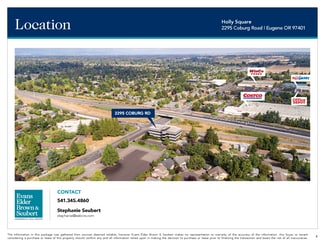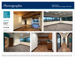 Holly Square  • Quality office space  • Good on-site parking  • Excellent location at Coburg Road & Beltline Highway Intersection SUITE 200 | Approximately 2,833 Square Feet  • Space includes entry with reception area and seven private offices, kitchen area, large conference room/office and private restroom  • Large windows provide abundant natural light  • Private restroom as well as access to common area restrooms.  • $1.45 per square foor per month, modified gross. Tenant pays their pro-rata share of utilities, janitorial & garbage service; approximately 34¢ per square foot per month.