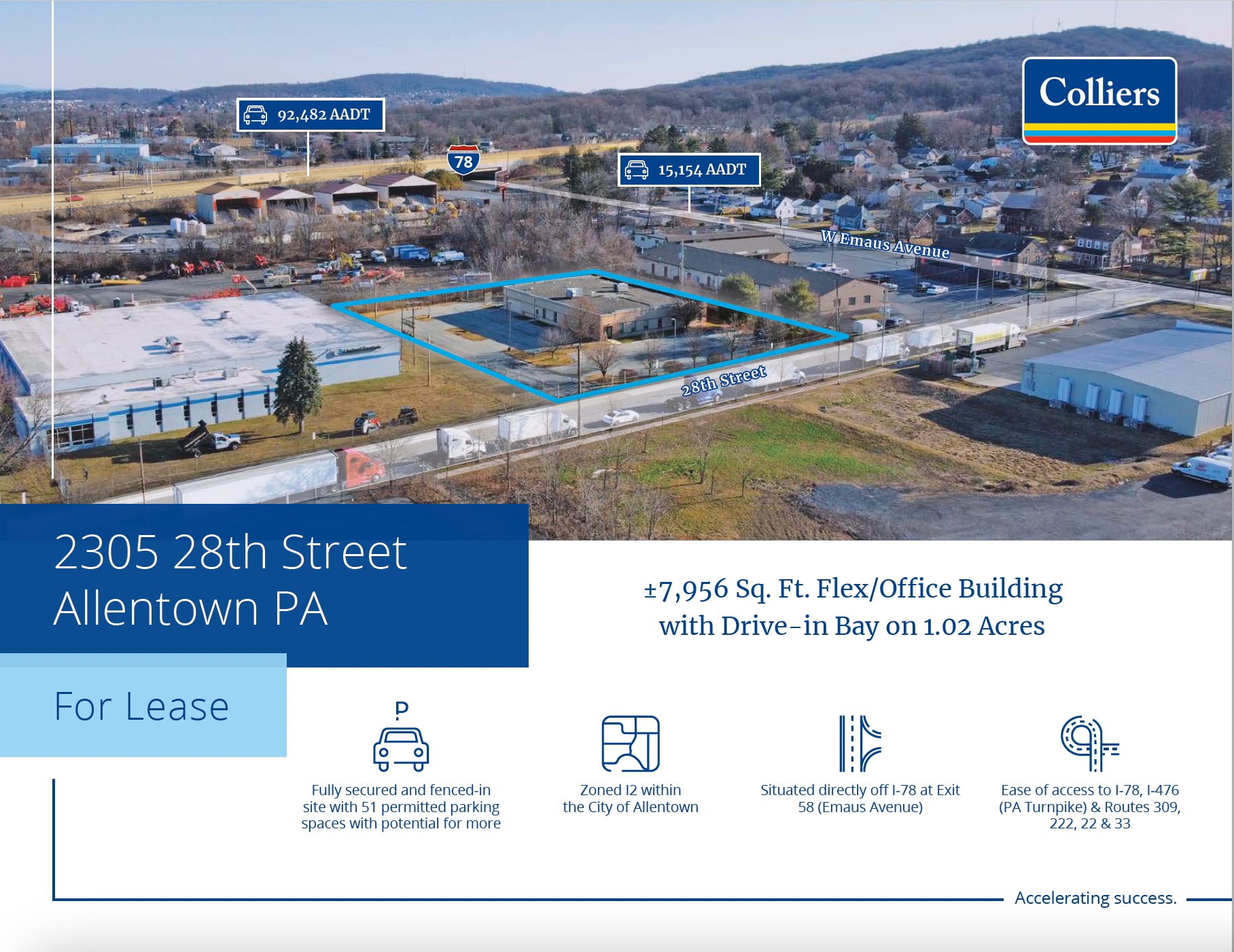 2305 28th St SW offers ±7,956 Sq. Ft. Flex space available for office and industrial use with drive-in bay on 1.02 acres. This property is fully secured and fenced-in site with 51 permitted parking spaces with potential for more. This flex building opportunity is conveniently located directly off I-78 at Exit 58 (Emaus Avenue) for ideal access to main roads for distribution potential. With 10 individual office spaces, large conference and break room, garage and large open area for industrial/warehouse use this flex space is a great opportunity for a small industrial business.