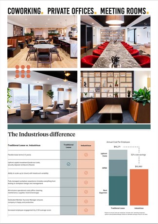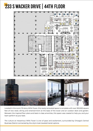 Take in breathtaking views of Chicago’s skyline from Industrious at Willis Tower, a dream flexible workspace located in the legendary 110-story Willis Tower. Our newly renovated location is perfect for solorpeneurs, small to midsize teams, and even large enterprises. With options for coworking, suites, private offices, and on-demand meeting spaces, there’s truly something for everyone. This beautifully designed space offers luxury amenities, a fitness center, and a stunning outdoor deck and garden. Enjoy an easy commute, with Union Station just 1 block away, or hop around the corner to Quincy Station for the Brown, Orange, Pink and Purple Lines. At the base of the tower, explore over 300,000 square feet of new shopping, dining and entertainment options, or stroll around Chicago’s thriving downtown neighborhood for even more excitement. Admire a bird eye view of the city while enjoying the best in hospitality and amenities at Industrious at Willis Tower.