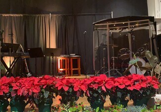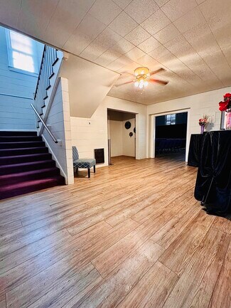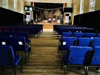 The main level includes a spacious sanctuary with high ceilings and a raised stage/platform, providing an open and welcoming environment suitable for worship services, performances, presentations, or assemblies. Natural light enhances the main worship area, creating a warm and inviting atmosphere. Several prior listings indicate that sound equipment and musical instruments may be included, adding immediate value for continued religious or performance-based use.