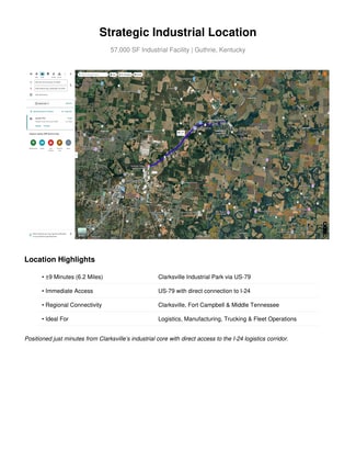 Strategically positioned near the I-24 corridor, allowing efficient access to Clarksville, Hopkinsville, and the greater Middle Tennessee / Southern Kentucky industrial market.