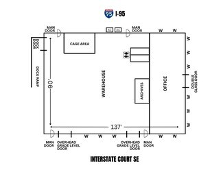This 12,320-square foot warehouse building was built in 1997 and is centered on a 1.16-acre lot. The former home of Florida Today Palm Bay, is a well-maintained property with easy access to I-95 via Interstate Court. The site has approximately 60 parking spaces, meeting current zoning codes for an office building. The building is concrete block construction with a stucco covering. All of the windows are covered with architectural shutters. The parking lot and the grounds are well-maintained and the shingle roof is in good condition.