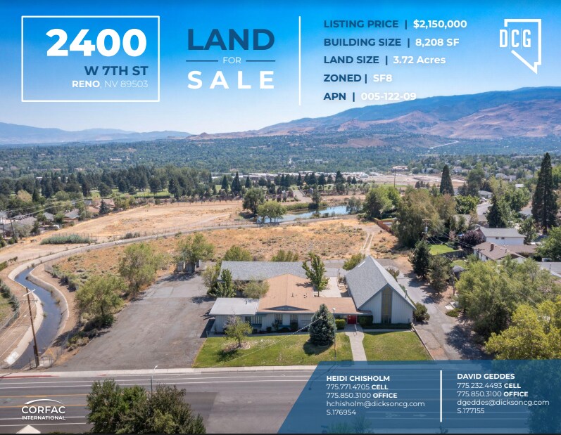 DCG is pleased to present 2400 W 7th Street for sale. This land property is 3.72 Acres of SF8-zoned land. There is a church building on the property that is 8,208 square feet that could be removed or renovated. This Residential infill parcel features level topography and clear views of the Sierras and Downtown Reno. Please see the attached flyer for more information.