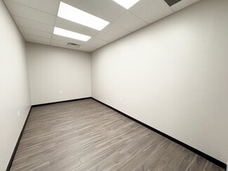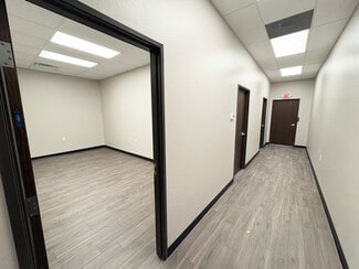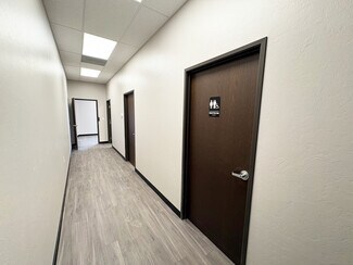 • The office area includes two private offices, a reception area, and bathroom.