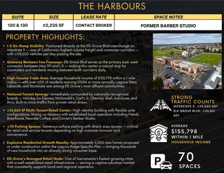 The Harbours offers ±2,235 SF of retail space for lease at 2475 Elk Grove Blvd in Elk Grove, California. Formerly occupied by a barber studio, Suites 120 & 130 provide an excellent opportunity for retail, service, or lifestyle users seeking strong visibility in one of Elk Grove’s most active commercial corridors. Positioned near the Interstate 5 and Elk Grove Blvd interchange, the property benefits from steady commuter traffic, easy access, and strong surrounding demographics. The center is supported by a healthy mix of national brands and established local businesses, making it a highly attractive location for tenants looking to serve both nearby residents and daily pass-through traffic.