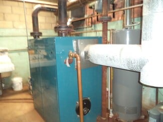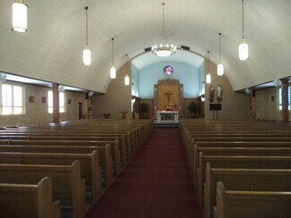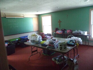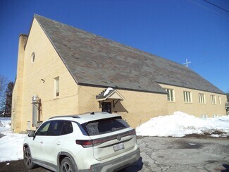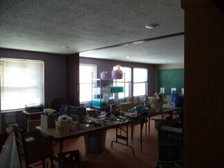 The church structure features classic brick construction with stained-glass windows, a wide sanctuary, and a sizeable lower-level hall that collectively accommodate up to 1,300 occupants. Ceiling heights range from 7 to 23 feet, providing volume and architectural presence suited for assembly, educational, or creative re-use concepts. The adjoining office/classroom building includes approximately twenty rooms on two levels, creating an adaptable environment for administrative, instructional, or specialty programming needs. Interior finishes include ceramic tile, VCT, carpeted surfaces, and insulated windows, while town-supplied water and sewer support straightforward operations.