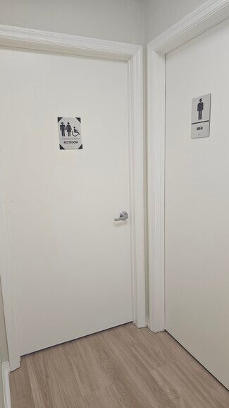 The space includes refreshed restrooms (men’s, women’s, and ADA-compliant), a breakroom with refrigerator space, and two separate AC units for efficient climate control.