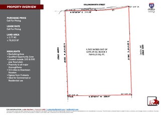 Prime land for sale, just 3.5 miles from downtown Houston Ideal for commercial or residential development Part of a revitalizing area with ample potential for growth Located within a qualified opportunity zone, offering significant tax incentives Situated outside the 100-year and 500-year floodplains, ensuring a secure investment Close proximity to major thoroughfares, ensuring excellent accessibility Perfect for investors, developers, and entrepreneurs looking to capitalize on Houston's growth