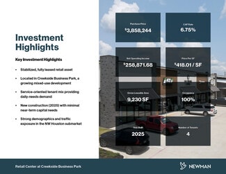 A premier 9,230 SF retail center completed in 2025, offering a "turn-key" investment with minimal near-term capital requirements. The property features modern architectural design and is situated within the elevated Creekside Business Park mixed-use development.
