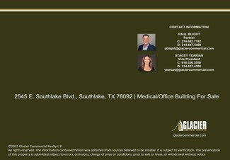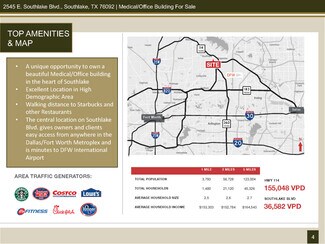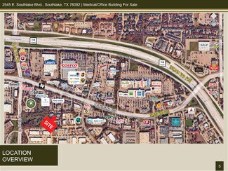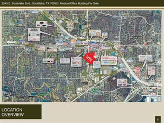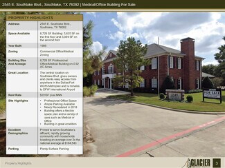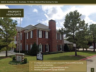 FEATURES: • A unique opportunity to own a beautiful Medical/Office building in the heart of Southlake • 8,729 SF Building: 5,635 SF on the first floor and 3,094 SF on the second floor. • Walking distance to Starbucks and other Restaurants • Suite offers Tenant a flexible space plan and a variety of uses such as Medical or Office • Very nice high-end finishes and options • Ample Parking • The central location on Southlake Blvd.gives owners and clients easy access from anywhere in the Dallas/Fort Worth Metroplex and is minutes to DFW International Airport • Building in great condition with new roof in 2018 • Building & Monument Signage Available