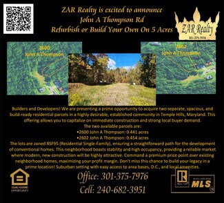 ATTENTION Builders and Developers! We are presenting a prime opportunity to acquire two separate, and spacious residential parcels in a highly desirable, established community in Temple Hills, Maryland. This offering allows you to capitalize on immediate construction and strong local buyer demand.
