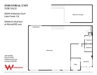 3,060 sf industrial property includes 460 sf permitted upstairs mezzanine storage. 423 sf office space (16% office) includes reception, office, kitchenette, 2 restrooms and shower. Do not disturb occupant, please contact Jim Wynne to tour. Virtual tour available at WynneCRE.com.