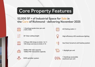 .IndustriCore offers a rare opportunity to acquire premium industrial space in the heart of Richmond, BC. This newly developed property by Waterwheel Development and Orion Construction features over 52,000 SF of modern industrial space designed for efficiency and flexibility. The building consists of 11 units, each with warehouse and mezzanine areas, 28-foot clear ceiling heights, and high-performance specifications including ESFR sprinkler systems, skylights, and LED lighting.