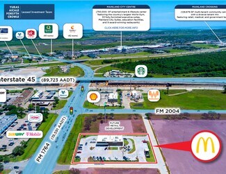 This McDonald's is prominently positioned just off Interstate 45, which sees more than 89,000 vehicles per day Prime Setting: The location features a prime setting in the newly constructed Shops at La Marque, a 21-acre retail development along Interstate 45 in the retail epicenter of La Marque, TX Major Retail Corridor: The site greatly benefits from its adjacency to Mainland City Center, a 750,000 SF mall featuring the country’s largest World Gym, 33 fully furnished executive suites, Mainland City Suites, education facilities, and nine award-winning restaurants Beneficial Proximity to Major Community Hubs: The property resides two miles from the entry to Lago Mar, a 2,033-acre master-planned community featuring 4,000 homes and 14,000 residents, and 3.5 miles from HCA Houston Healthcare Mainland (222 beds, 925 employees) Excellent Demographics: Nearly 85,000 residents live within a five-mile radius of the subject property, while the average annual household income within a one-mile radius is over $126,000 High Growth Market: Projected population and income increases within 1-, 3-, and 5-mile radii over the next five years poise McDonald's and La Marque for steady concurrent growth.
