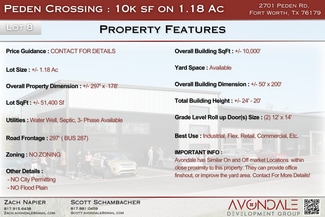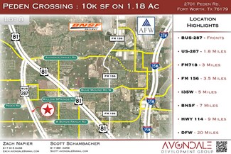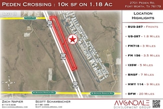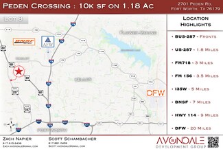Strategically located just minutes from major thoroughfares, including Route 287, FM 718, FM 156, and Interstate 35W. Located near the new Eagle Mountain High School, within the Eagle Mountain-Saginaw ISD, and surrounded by fast-growing residential and commercial developments, Peden Crossing sits in the heart of one of Fort Worth's most active growth corridors. The widening of W Bonds Ranch Road and the nearby 1,000-lot residential community further enhance the area's momentum, creating strong future demand for local business services.
