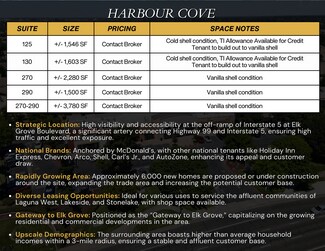 Harbour Cove offers a rare opportunity to secure modern retail space along one of Elk Grove’s most traveled corridors. Located directly off the Interstate 5–Elk Grove Blvd interchange, the center benefits from nonstop visibility and effortless access for both local residents and freeway traffic. The available suites range from cold shell to newly finished vanilla shell, giving tenants the flexibility to customize their layout and brand experience. Surrounded by established neighborhoods like Laguna West, Lakeside, and Stonelake—and supported by thousands of new homes planned in the immediate area—Harbour Cove is positioned for long-term growth. National brands including McDonald's, Holiday Inn Express, and multiple fuel stations draw consistent daily activity, making this an exceptional location for retail, service, dining, and neighborhood-oriented concepts.