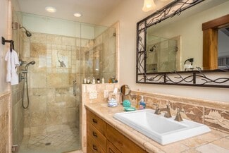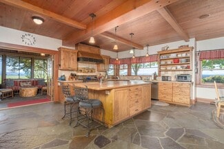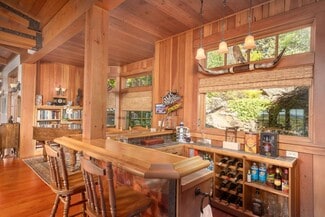 • THE MAIN HOME was built on a hillside, designed in consultation with Neil Wright out of Sun Valley, Idaho. Masterfully constructed by craftsmen and artisans in 2000. Attention to detail and comfort is apparent from the minute you enter this amazing home. An impressive 7,700 sq. ft. of living space under one roof. Four bedrooms, 5 1/2 baths. The wood and stone construction blends perfectly with the landscaping. The owners have used reclaimed wood from a historical building in Yosemite, milled in McCloud, to create the massive beams and the large plank flooring you will find in the home. The great room, kitchen, enclosed sunroom, office, and master suite are on the main floor, and the additional three bedrooms with en-suite baths, are strategically built along the contour of the hillside. The wine cellar, mud room with bath, exercise room, storage room, and garden potting room are on the lower floor. The gourmet kitchen is a delight, with the baking center, butcher block island, 3 sinks, 2 dishwashers, 6 burner gas range, dual ovens, and butler's pantry.