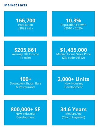 • Less than 10 minutes driving distance to Downtown Hayward and Hayward BART Station