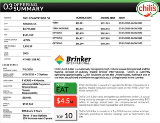This offering presents the opportunity to acquire a high-quality, corporate-backed net lease asset occupied by Chili's Grill & Bar, a nationally recognized brand operated by Brinker International (NYSE: EAT), a publicly traded company generating approximately $4.36 billion in annual revenue. The tenant has successfully operated at this location for over 20 years and recently executed a 10-year lease extension, demonstrating long-term commitment to the site. The property consists of a 5,991-square-foot freestanding restaurant building situated on a 47,480-square-foot corner parcel with approximately 116 feet of frontage along Countryside Drive at a signalized intersection, offering excellent visibility and access. Located within Monte Vista Crossings, a dominant 1.4+ million square foot regional power center ranked among the most visited in California, the asset benefits from exceptional consumer traffic driven by surrounding national retailers including The Home Depot, Target, Safeway, Lowe's, Kohl's, and In-N-Out Burger. Monte Vista Crossings is further enhanced by three monument signs along California State Highway 99, providing unmatched regional visibility and accessibility. The asset is structured as a corporate ground lease (leasehold) with a true triple-net (NNN) lease and no landlord responsibilities, offering passive, management-free income backed by a proven operator in one of the Central Valley’s premier retail destinations.
