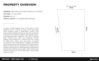 Located at 2823 Gallatin Pike in the heart of East Nashville, this +/- 0.55-acre corner lot for sale offers prime visibility along a high-traffic corridor with approximately 25,000 vehicles per day. Surrounded by a strong mix of national retailers and medical users-including McDonald's, Wendy's, Taco Bell, Smoothie King, O'Reilly Auto