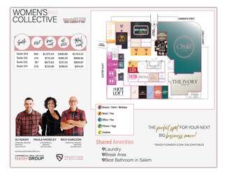 The Forge is a stunning redevelopment of downtown Salem’s former Liberty Plaza building. This three-story plus basement structure is undergoing a vibrant transformation. The first floor boasts roll-up door access for indoor/outdoor seating, with ongoing talks to bring in craft ice cream, dumplings, matcha/boba tea, wine tastings, and more. The second floor hosts a women’s collective with 24 wellness and beauty suites alongside Clink!, a chic French-American bistro, and Salem’s finest women’s restroom. Suites are filling fast—don’t miss your chance to join The Forge!