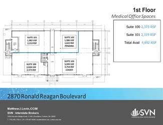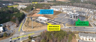 For lease in rapidly growing Cumming is new construction of 19,844 rentable square feet offering medical office, conventional office and ground level retail storefront space in a professional park setting. Only 1,906 RSF+- to 4,629 RSF+- of space remains.  The highly visible corner location with 400’+ feet of frontage and a 19,000+ traffic count provides branding opportunities. The 2.5 acres site has 115 parking spaces, a 6 per 1,000 SF parking ratio.