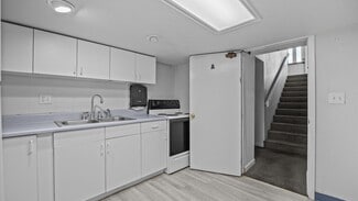 • The lower level has two private entrances surrounded by windows. The first leads to a reception area, waiting room, four large offices, storage, and a break room. The second entrance includes three offices, a full kitchen, and a half bathroom.