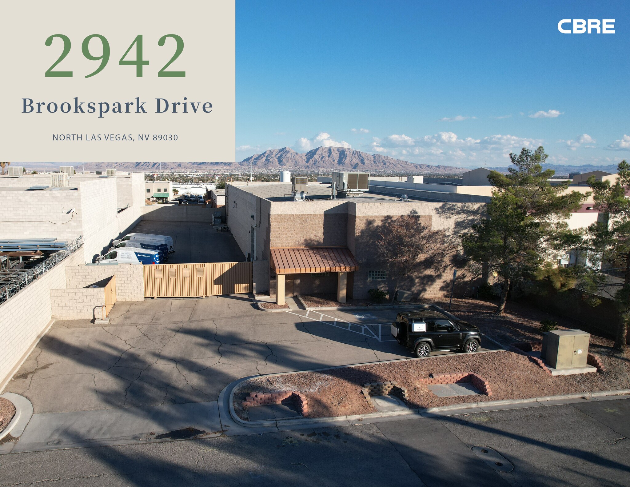 2942 Brookspark Drive is a ±10,112 SF freestanding industrial building on ±0.44 acres. It lies in the heart of North Las Vegas, off E. Brooks Avenue and N. 5th Street. The Property is ±1.7 miles to Cheyenne Avenue/I-15 Interchange and ±3.6 miles to Craig Road/I-15 Interchange, with ample retail and service amenities nearby. The property features 100% HVAC, ±1,150 SF office space with two (2) restrooms, break room, reception area, conference room, ±8,962 SF warehouse space with one (1) 12'x12' grade-level truck door, a ±6,450 SF of paved, secured and gated yard space, 800 amps of 120/208v 3-Phase power, and is Zoned M-2 (North Las Vegas). LEASE RATE : $1.20/SF (NNN); CAMs : $0.162/SF; NOW AVAILABLE!