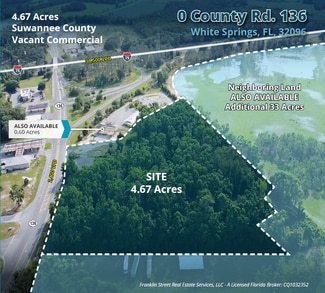 -High Traffic Counts: 38,500 VPD on I-75 -Strong Visibility: 435’ of frontage plus full median cut access. -Flexible Commercial Zoning: Allows for gas station, convenience store, truck parking, and other intense commercial uses. -Expansion Potential: Additional neighboring parcels (0.60 acres + 33 acres) available for larger development. -Strategic Location: Situated in White Springs, Suwannee County, an emerging commercial corridor. -Competitive Pricing: Listed at $885,000 for 4.83 acres of prime development land.