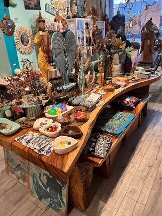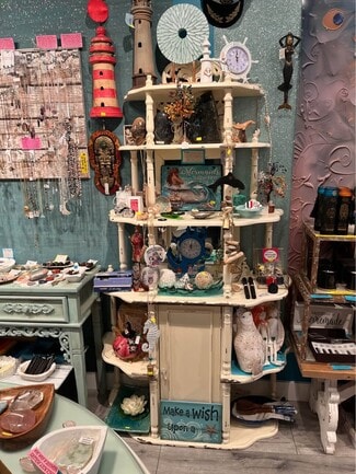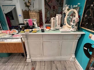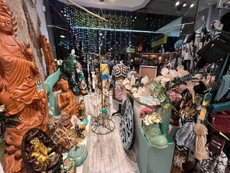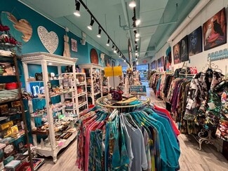 The space is fully built-out and move-in ready, renovated just a year and a half ago, currently operating as a boutique clothing/jewelry/gifts/crystals store. The interior features a stylish boutique layout with a fitting room, large display storefront windows, modern retail lighting, and custom Boho style shelving and display fixtures. The existing retail setup allows a new tenant to open quickly with no renovation or build-out.