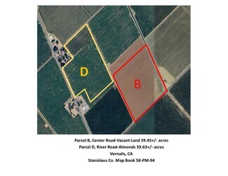ALMONDS. 39.63 acres of Independence (7ac.), Nonpareil (16ac.), Monterey(8ac.) and Wood Colony (8ac.) almonds in Vernalis. Orchard is irrigated by a double-line drip system, with irrigation water provided by the El Solyo Water District, which has both riparian and appropriative water rights. Located on the Westside of northern Stanislaus County, this property would be an excellent location for someone wishing to build a home in a quiet rural setting, but have an easy commute to the Bay Area. In addition to this parcel, an adjacent 39.45 acre parcel is also on the market. If needed, farm management for the orchard is also available.