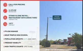 TexDOT is done with its 6 year freeway expansion that devestated - but improved- this immediate area. It is now once again a booming area. Many new businesses in the immediate area! Most recently: Dutch Brothers and Black Rifle coffee. Other neighbors are Chick-Fil-A , Pizza Hut, Mc Donalds, Whataburger, Shipley's Donuts and many more. Also adjacent to Temple High School and Wildcat Stadium. Deal direct with the owner for a no-nonsense, mutually beneficial deal. Lease rate negotiable, courtesy to brokers!
