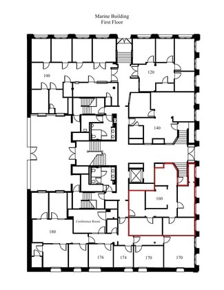 The Marine building was built in 1875. In 2015, the roof, HVAC Units, HVAC duct work, ceilings and lighting were replaced. The building features slate floors on the first floor and hardwood floors throughout the second floor. The building contains large office suites on the first floor along with three executive suites that share a conference room and coffee bar. The second floor contains 21 executive suites with a common reception area, waiting areas, along with access to three shared conference rooms and a shared kitchen. Utilities, night cleaning and trash removal are included. This building is located on the corner of 21st and Mechanic Streets in the historic downtown district. A parking garage and surface lot are adjacent to the building.