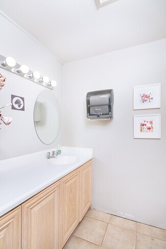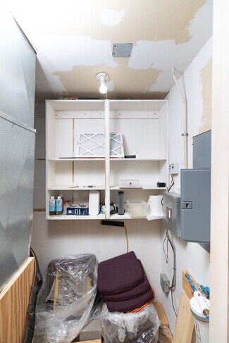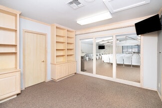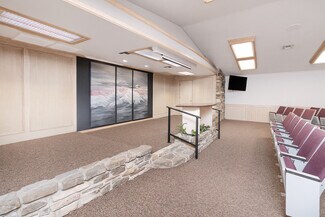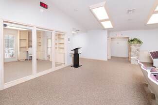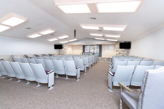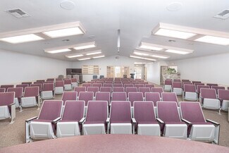 The property features existing theater-style seating, making it perfectly suited for a church, event venue, performing arts space, lecture hall, or presentation center. Additional highlights include dedicated office space, ample storage areas, two restrooms, and private on-site parking for convenience and accessibility.
