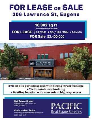 Dynamic area in Central Eugene. Located in the recreation and mixed use mill district at the base of Skinner Butte, the former REI space is available April 2026. 18,900 SF. For LEASE or BUILDING SALE. Additional tenant spaces leased month to month and available for more space to the right Owner-User or large tenant. Dedicated parking off street. 70 spaces. On-street parking also available. District area additional parking available off street. Located at the intersection of the Downtown business District and the Whiteacker Neighborhood and Skinner Butte Park along the river. Near commercial hubs of 5th street, Riverfront developments, and CBD. Zoning S-W.