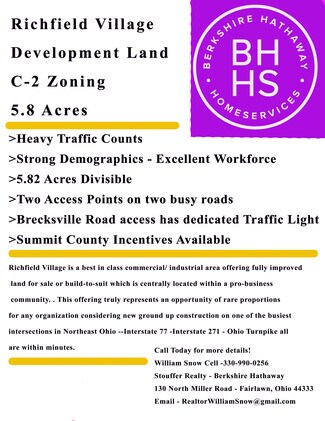 Heavy Traffic Counts Strong Demographics - Excellent Workforce 5.82 Acres Divisible Two Access Points on two busy roads Brecksville Road access has dedicated Traffic Light in Front Summit County Incentives Available This offering truly represents an opportunity of rare proportions for any organizations