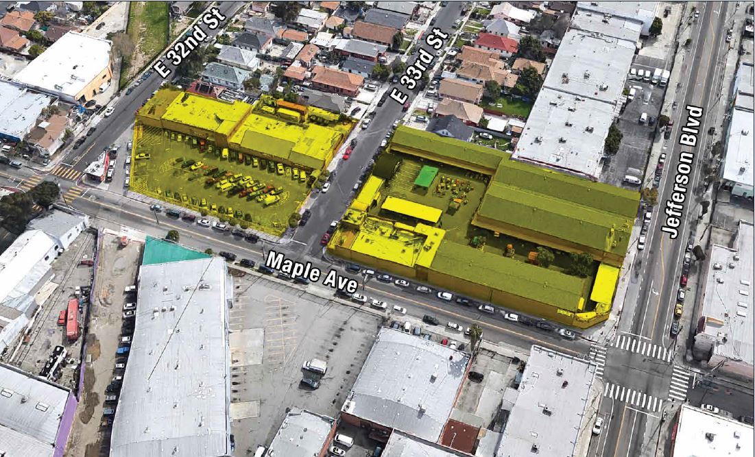 The subject consists of four contiguous parcels located block-to-block along Maple Ave between Jefferson Blvd and 33rd St, and two parking lot parcels on 33rd St that are separated by an industrial building on two additional parcels. The parcels total approximately 99,980 SF of land (2.3 acres) and includes 47,575 SF of buildings, which were formerly used as the Los Amigos Retail Outlet/Swap Meet, and are now vacant. The property is situated in the Historic South Central District of Los Angeles. The property is a short distance south of Downtown Los Angeles, with USC, Banc of California Stadium, Exposition Park and the Natural History Museum just 3/4-mile to the west. The subject is also just minutes away from the South Park District, the Convention Center, Staples Center, and LA LIVE. Additionally, a Metro Bus Line stop is right in front of the subject on Maple Ave, offering access to all light rail, subway and bus destinations in Los Angeles County. The Harbor (110) and Santa Monica (I-10) Freeways are also within one mile of the subject. The subject offers an owner/user the opportunity to reposition the site to many possible applications. Possibilities include an open air facility for a brewery, gym, food court or ghost kitchen. Other potential uses are as a creative campus; charter school; artist community; or industrial compound. Not divisible: All parcels must be taken together. Rent TBD (call broker).
