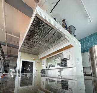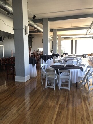 The second floor is available for lease with approximately 5,000 square feet of event space. Mostly open floor plan with one prep/catering kitchen and separate bar back prep kitchen, men and women’s bathrooms, storage rooms, with possible use of equipment (negotiated with lease). Prior occupancy permit stated 160 people. Sprinklered. Audio and visual components are currently in place. Lots of natural light. Mountain and city views.