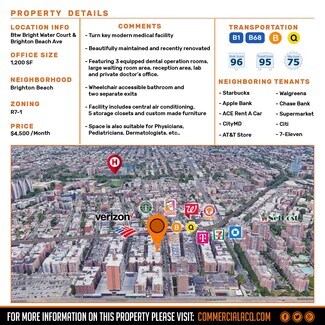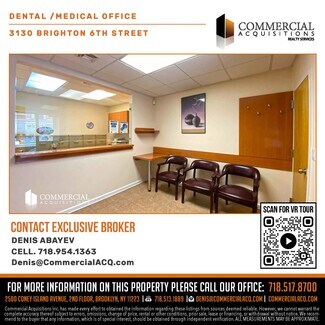 3130 Brighton 6th Street - Unit #1D is a 1,200 sq.ft. medical office co-op. The space was a dental office and is still equipped with fully operational state-of-the-art dental equipment. Unit #1D contains two (2) exam rooms, three (3) workstations, and one (1) lab. There is a receptionist and waiting area in the front and a breakroom for staff in the rear. Unit #1D offers plenty of medical storage space and is easily accessible from the street or by the interior for patrons that live in the co-op building. Owner would also consider a sale for $525,000.