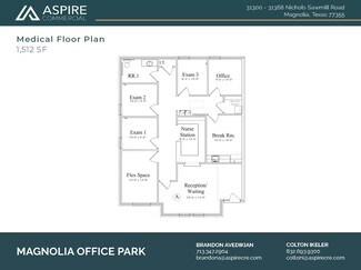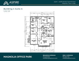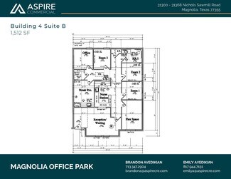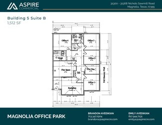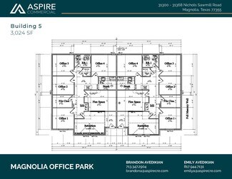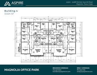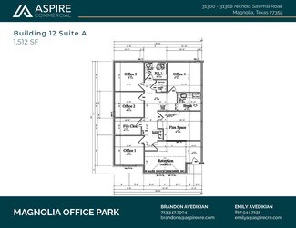 Custom new office condo for sale in Magnolia, Texas! Conveniently located in the Magnolia Office Park, off Nichols Sawmill Road, this unit offers offer just over 1500 SF of upper end office space with easy accessibility. This highly traveled area is less than a mile from the intersection of FM 1774 and Nichols Sawmill Rd and minutes from both FM 1488 and SH 249 Tollway. This custom office space offers 10 foot ceilings, 8-foot glass & iron entry door, Cat 6 wiring, surveillance cameras, granite countertops, handicap accessible bathrooms, 16-SEER HVAC, custom lighting, wood-look tile flooring, landscaping and 10 parking spaces.  This well-designed office park is a rare opportunity in Magnolia with current units occupied by a local developer, engineering firm and doctors office coming soon. Ideal build-out completed for a professional medical office space, ready to accommodate a psychologist, counselor, therapist, audiologist, cardiologist, physical therapist, chiropractor.